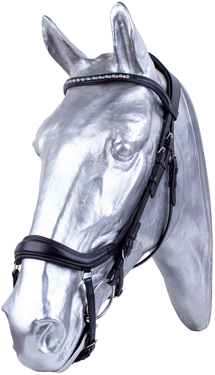 Anatomická uzdečka s tvarovaným nánosníkem, který minimalizuje tlak na hlavní obličejové nervy. Extra vypodložený nátylník eliminuje tlak na krční a šíjové svaly a umožňuje větší volnost pro pohyb uší, zdobená čelenka krystaly dodává uzdečce eleganstní vzhled. Dodáváno včetně plátěných otěží se zarážkami.