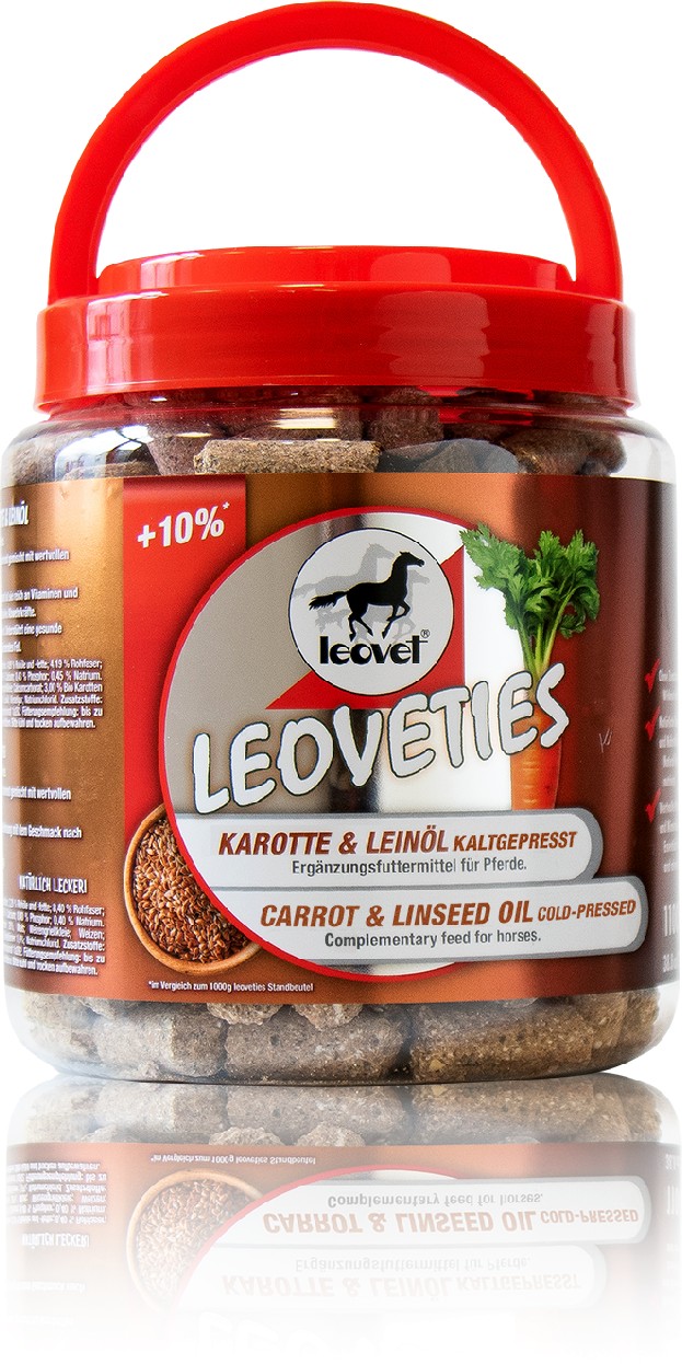 Chutné koňské pamlsky - Leoveties Mrkev a lněný olej! Leoveties jsou lahodné koňské pamlsky s přírodní příchutí mrkve a za studena lisovaného lněného oleje - kombinace, kterou mnoho koní miluje. Tyto pamlsky jsou bohaté na přírodní vlákninu, esenciální vitamíny a minerály a nabízejí zdravou a výživnou odměnu. Zcela bez umělých aromat!