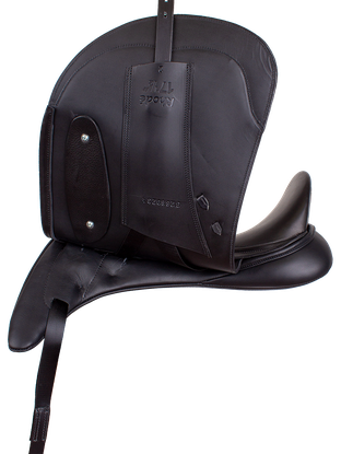 Monoflap dressage saddle with adjustable knee roll. The saddle is built on a deep saddle tree with a very narrow twist (GRP SLIM). These features guarantee the rider a deep seat. A distinctive knee roll gives perfect support for the legs. It is made of soft foam material and it is attached to the saddle flap with screws that allow to change the knee roll position as needed. Very comfortable wool flocked sandwich type panel is available in two versions: 1) KK version – panel is longer with a classic gusseted shape. This version enhances deep seat feeling and closer contact with the horse. 2) MK version – panel is wider and comes sooner out of the horse´s back. This version is suitable for short backed horses.