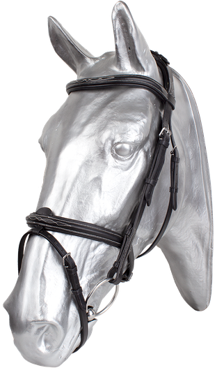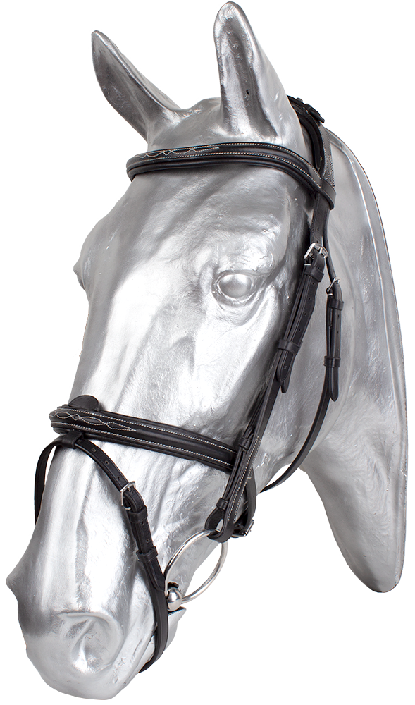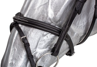 Uzdečka vyrobená z kvalitní kůže s měkce podloženým anglickým kombinovaným nánosníkem a bílým kontrastním prošitím. Poutko na podpínací řemínek je odnímatelné. Dělený, měkce polstrovaný nátylník, který nevytváří tlak na zátylek. Dodáváno včetně plátěných otěží se zarážkami.