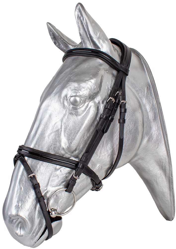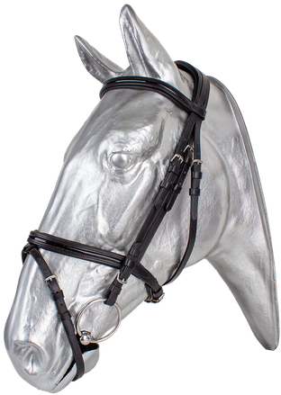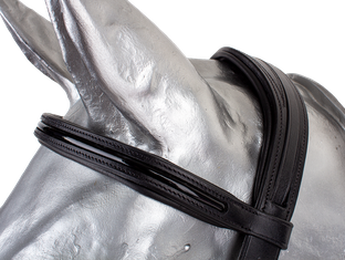 Elegantní uzdečka, prošívání tón v tónu barvě kůže, anatomický nátylník i s měkce vypolstrovaným anglickým nánosníkem, přináší největší komfort pro koně. Velmi elegantní provedení, čelenka a nánosník zdobený lakovanou kůží. Dodáváno včetně plátěných otěží se zarážkami.