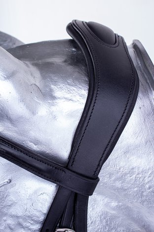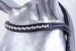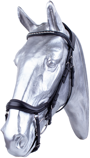 Anatomická uzdečka s tvarovaným nánosníkem, který minimalizuje tlak na hlavní obličejové nervy. Extra vypodložený nátylník eliminuje tlak na krční a šíjové svaly a umožňuje větší volnost pro pohyb uší, zdobená čelenka krystaly dodává uzdečce eleganstní vzhled. Dodáváno včetně plátěných otěží se zarážkami.