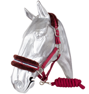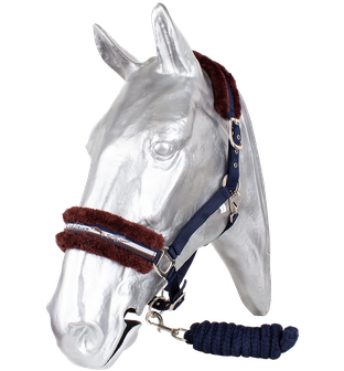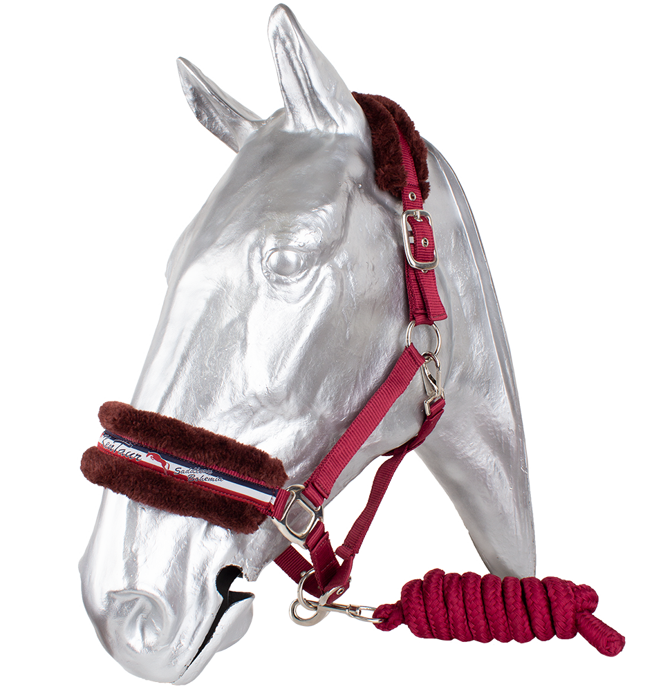 Luxusní ohlávka s vodítkem. Vyrobena ze silného polyesterového popruhu s měkkými hranami. Nánosník zdoben vytkanou stuhou. Kvalitní zesílené kování. Nastavitelný nánosník, oboustranně nastavitelný nátylník, podhrdelník s praktickou karabinou. Nátylník i nánosník podložen umělým beránkem. Pletené vodítko z polyesterových vláken je měkké a příjemné do ruky.