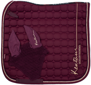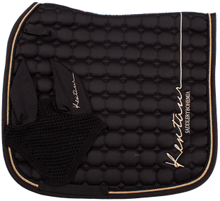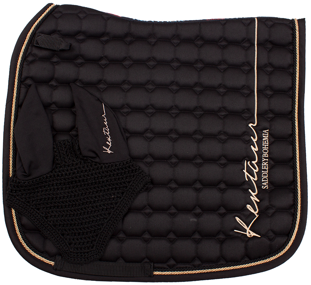 Drezurní dečka i náušníky s rosegold logem Kentaur. Dečka olemována dvojitou kroucenou šňůrou. Spodní materiál z hi-tech materiálu, který výborně absorbuje a odvádí pot od koně.