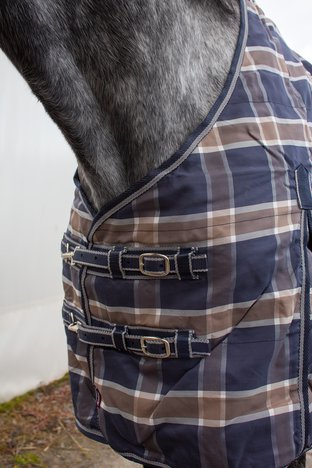 Oblíbená stájová deka z pevného a odolného polypropylenového materiálu s podšívkou. Tvarovaný hřbet, rozparky po stranách, křížové zapínání, posuvné zapínání s karabinami na prsou.