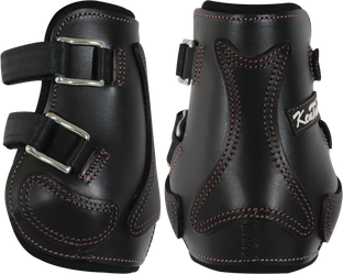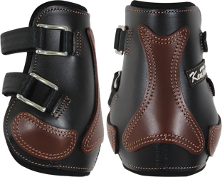 Kožené zadní stahovací chrániče se zapínáním na pevné pásky se suchým zipem YKK. Neoprenové polstrování lemované lycrou.